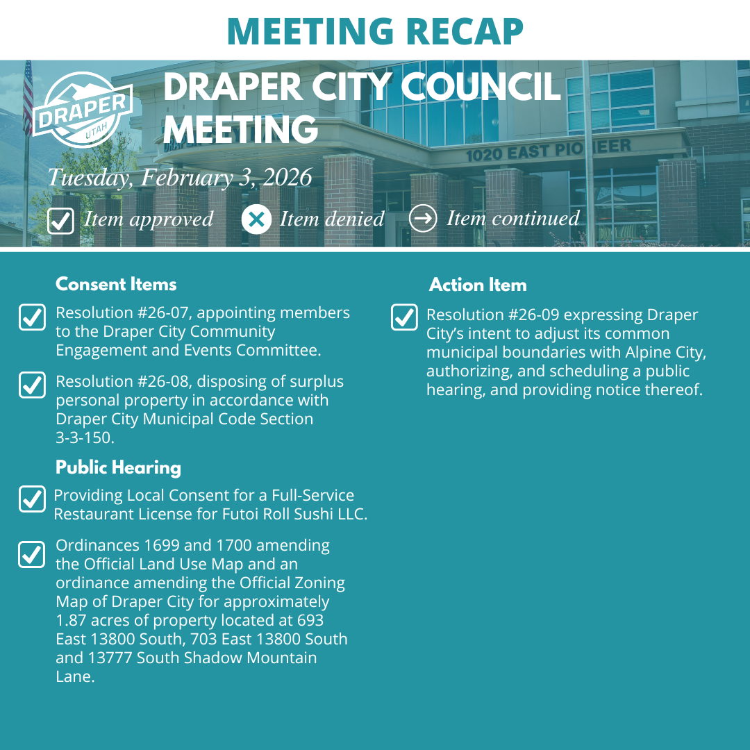 Receive notifications via email or text from Draper City regarding emergencies, traffic/construction alerts, news and events.